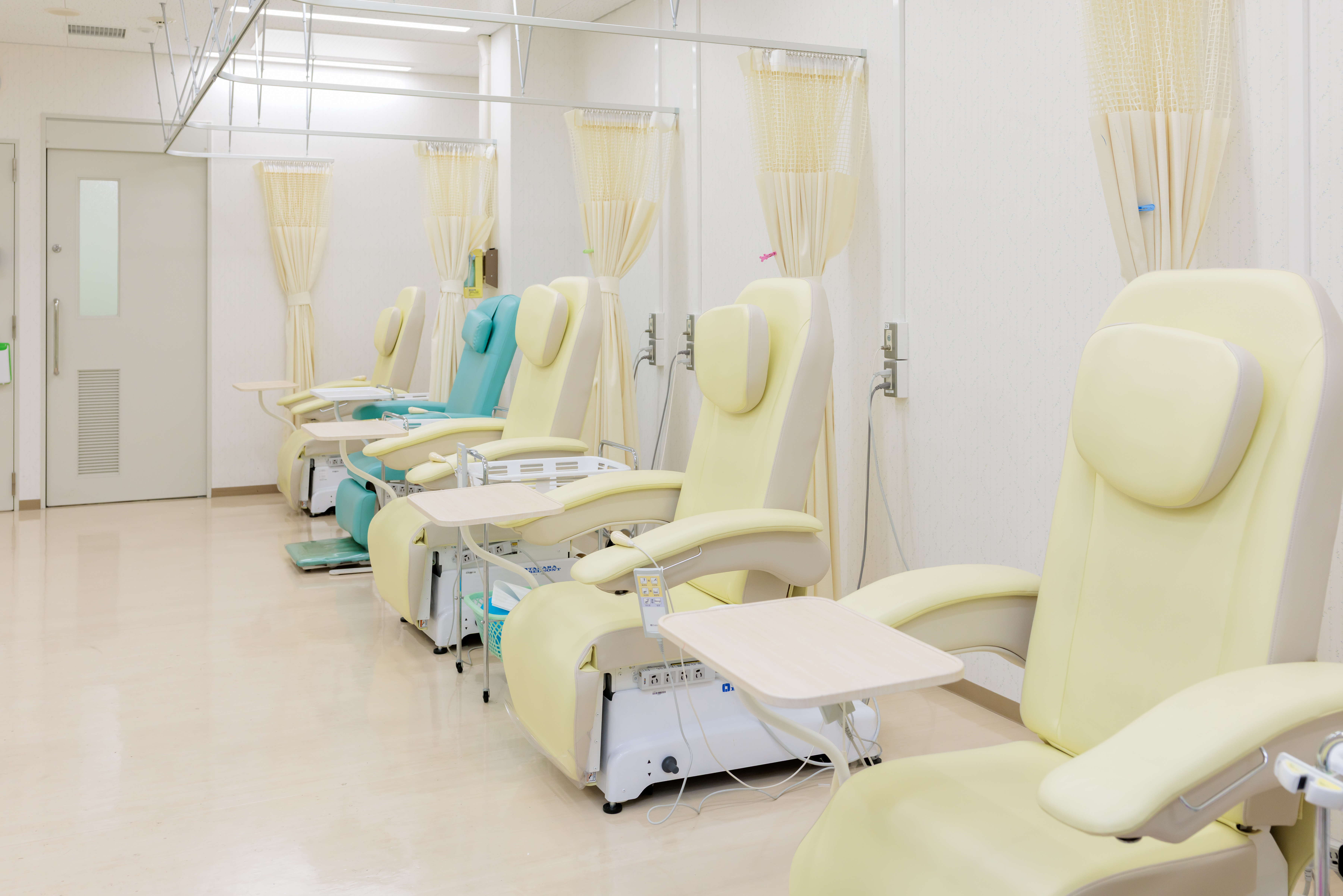 外来化学療法センターは、通院しながら、がん薬物療法(抗がん剤の点滴によるがんの治療)を受けられるための治療室として、2004年1月に開設しました。2008年4月に25床、2016年9月からは40床に拡大工事を行い、多くの患者さんにご利用いただいています。