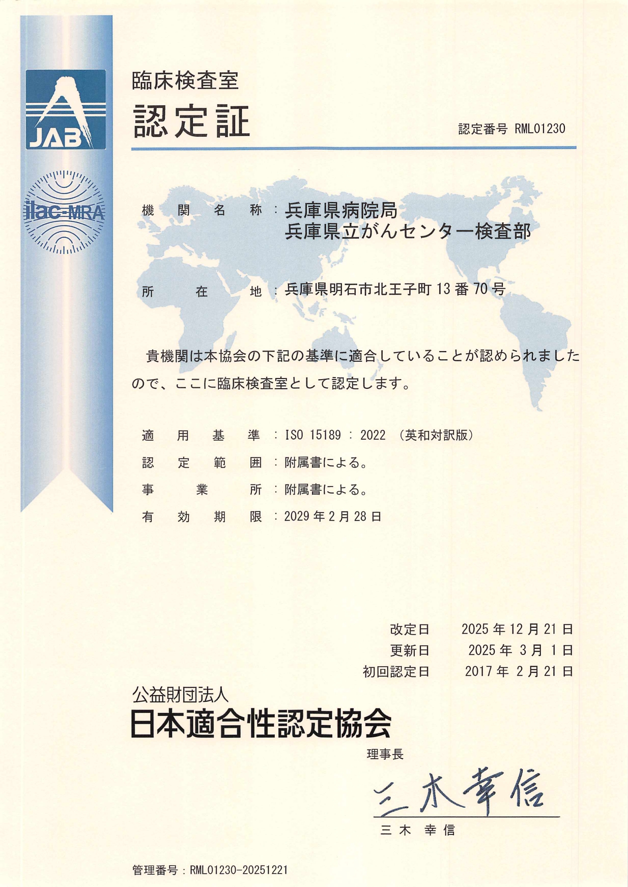 当検査部は、2017年2月21日に臨床検査の国際規格であるISO 15189(臨床検査室-品質と能力に関する要求事項)の認定を取得しました。その後、定期サーベイランス、再審査を受け更新を継続しています。認定範囲には、検体検査部門(一般、血液・輸血、生化免疫、微生物)だけでなく、がん診療には不可欠な病理部門・生理機能部門も含まれています。