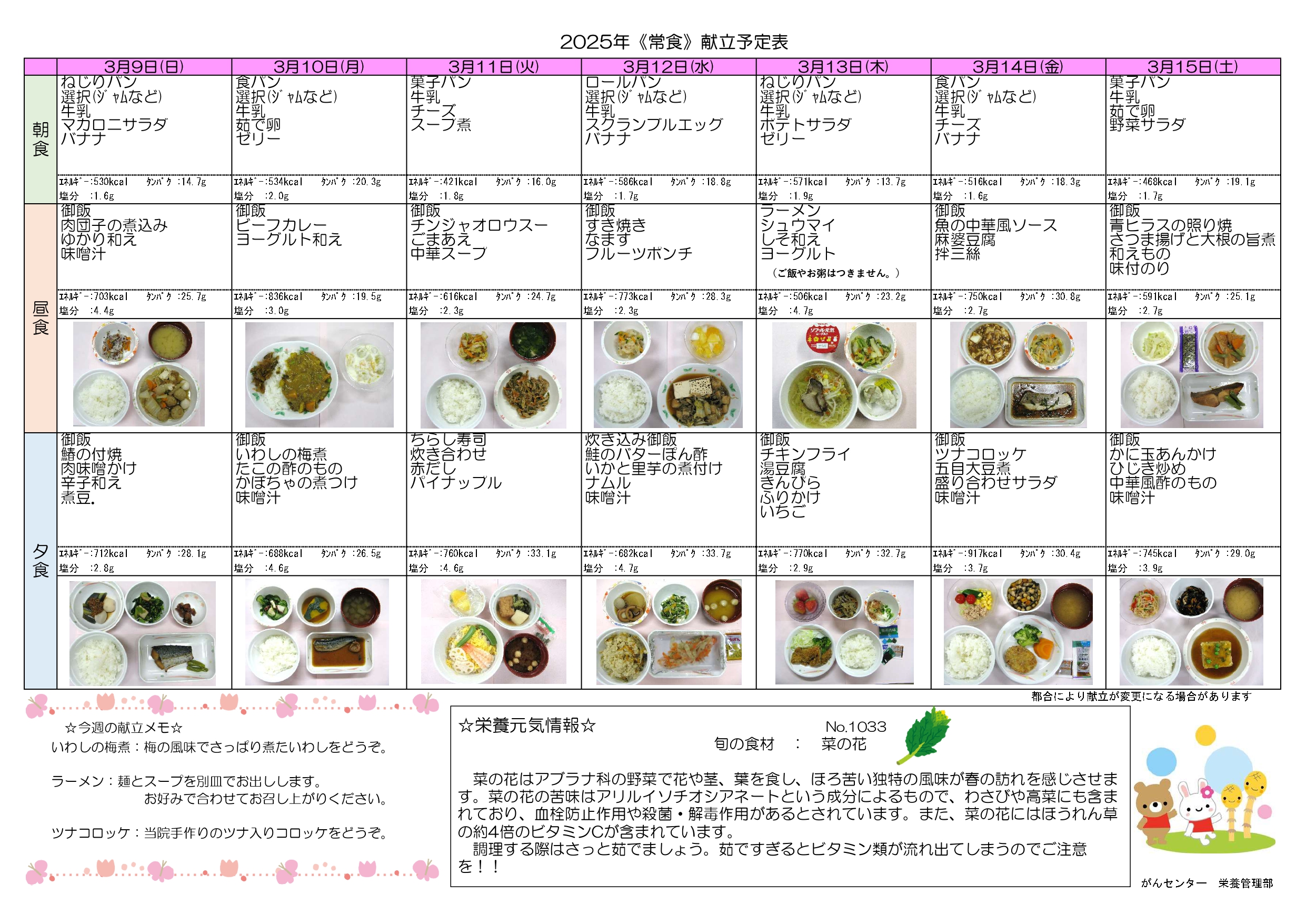 入院患者さんのお食事(常食)の献立表はこちらをご確認ください。